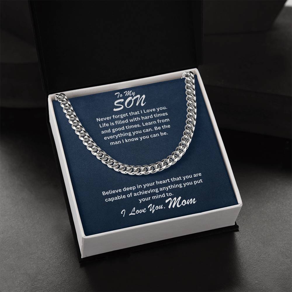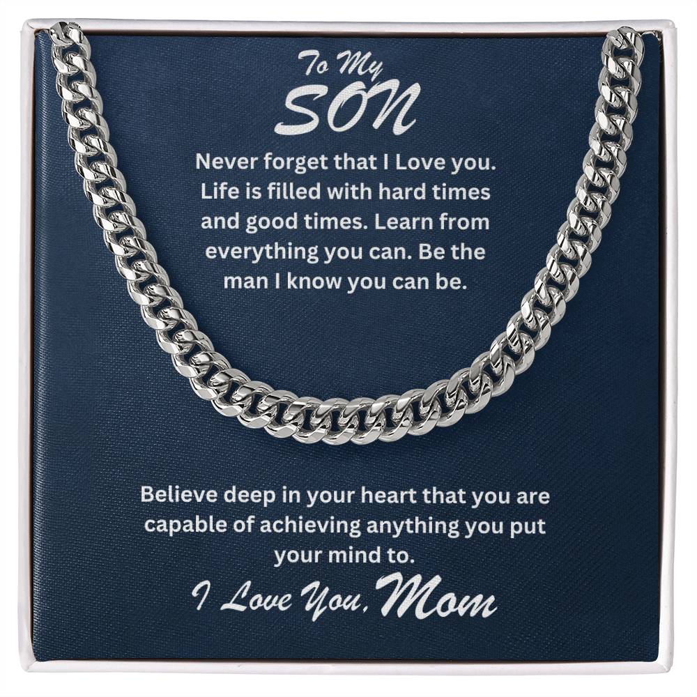 Never forget that I Love you. Life is filled with hard times and good times. Learn from everything you can. Be the man I know you can be. Believe deep in your heart that you are capable of achieving anything you put your mind to.