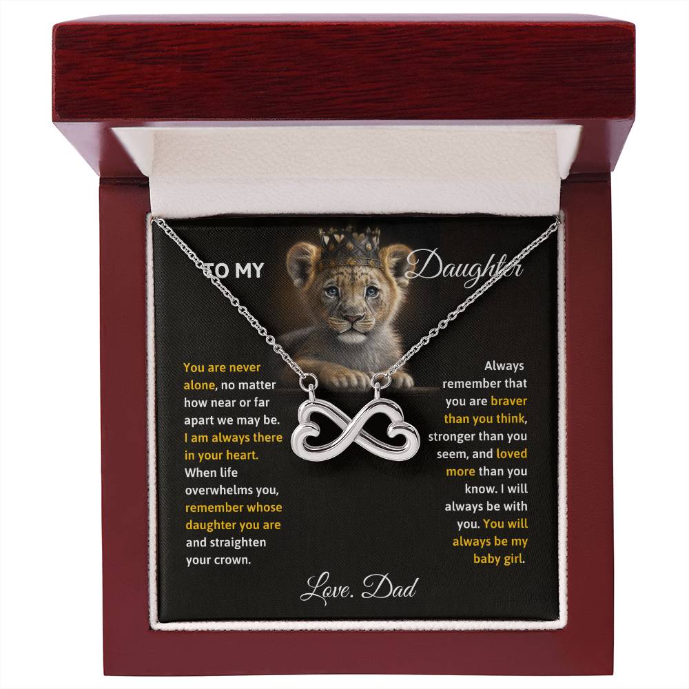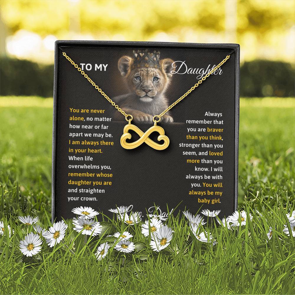 You are never alone, no matter how near or far apart we may be. I am always there in your heart. When life overwhelms you, remember whose daughter you are and straighten your crown. Always remember that you are braver than you think, stronger than you seem, and loved more than you know. I will always be with you. You will always be my baby girl.